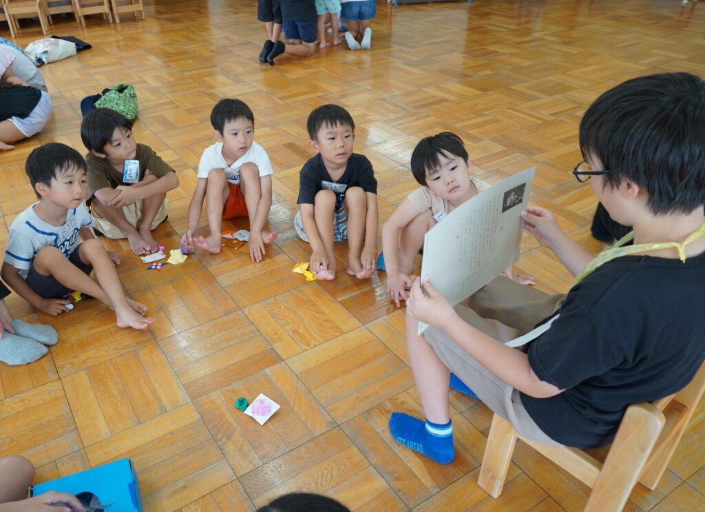 笑顔満開計画 2025.09.29 9月18日、昨年に引き続き、今年度も名東小学校の5年生の皆さんが保育園に来てくれました。年下の子が笑顔になる計画を考え、地域の役に立つ経験をするという「笑顔満開計画」。4,5歳児クラスの子どもたちが楽しめるようにと、5年生の皆さんが、様々なあそびを考えてきてくれました。 楽しい会話に、思わず笑い声が(4歳児 しろくま組) 紙芝居を読んでもらう子どもたち(5歳児 くじら組) 優しく接してくれるお兄さんお姉さんたちとの交流に笑い声と笑顔があちこちに!まさに笑顔満開でした。