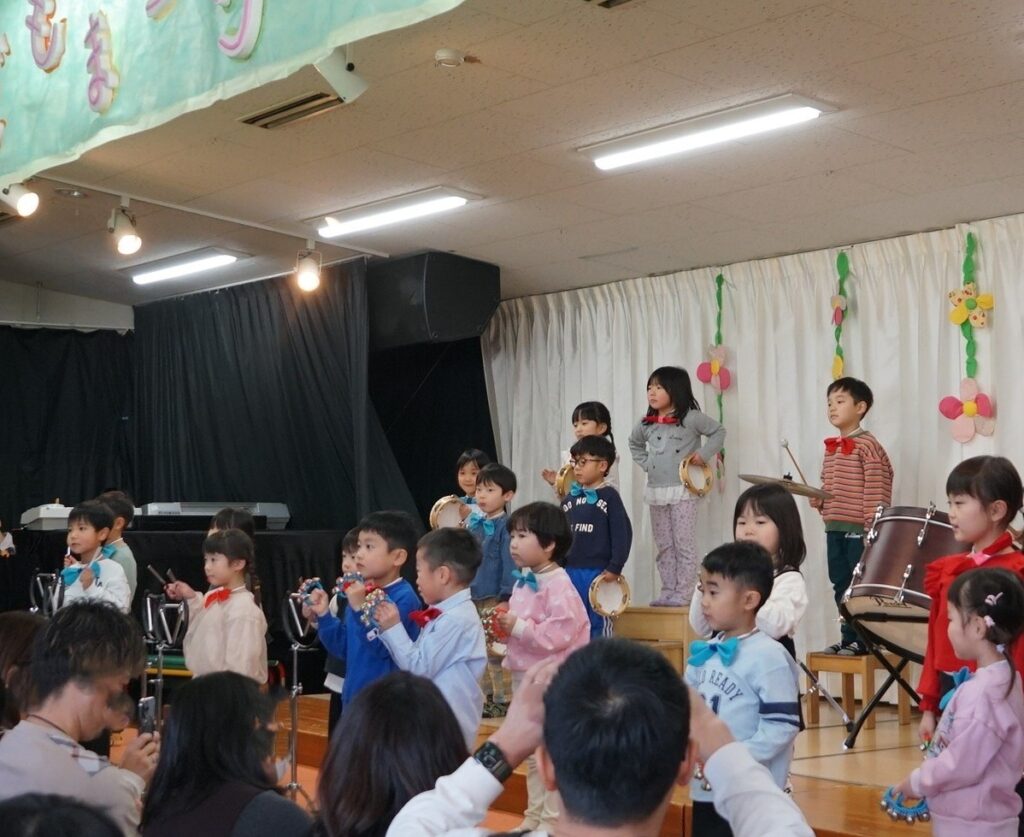 指揮の先生をよく見て、器楽の演奏を披露。(4歳児しろくま組)