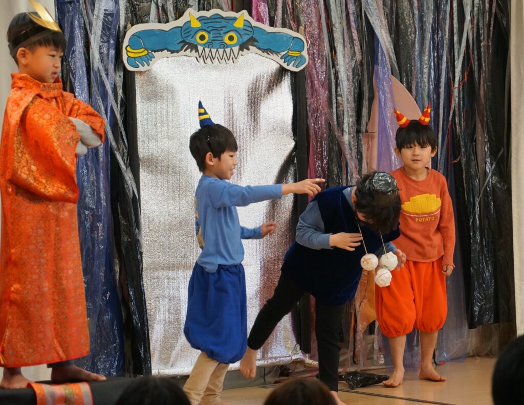 絵本『じごくのそうべえ』をもとに劇づくり。えんま大王の裁きを受ける山伏のふっかい(5歳児 くじら組)